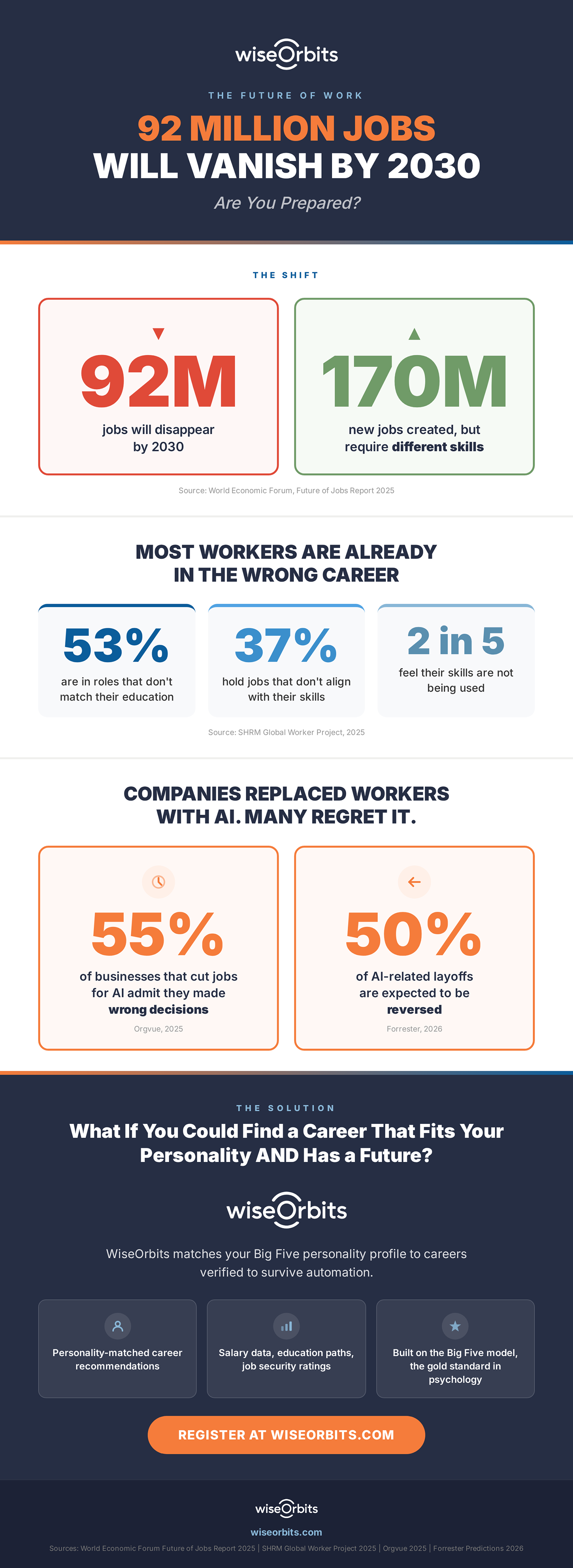 TORONTO, CANADA, April 14, 2026 /EINPresswire.com/ -- The World Economic Forum's Future of Jobs Report 2025 projects that 92 million jobs will be displaced by 2030. Another 170 million new ones will be created. The new jobs require different skills, pay different wages and exist in different locations. A separate study by SHRM's Global Worker Project found that 53% of workers worldwide are already in roles that don't match their education or training.WiseOrbits, a career guidance platform built on the Big Five personality model, is preparing to release an updated assessment system. The platform matches personality traits to careers with strong projected job security and filters out jobs that are shrinking or at high risk of automation.